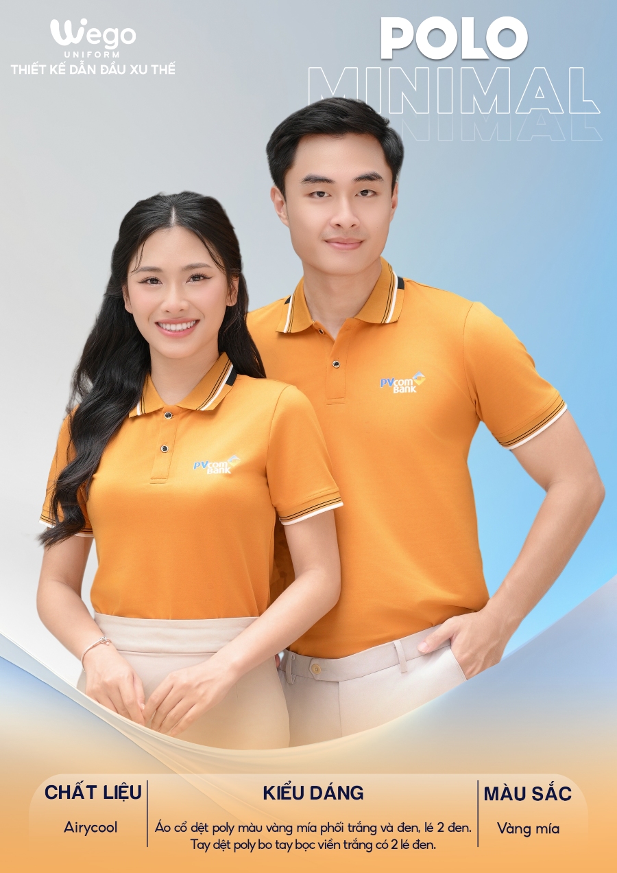 Áo đồng phục Minimal Polo: Màu vàng mía phối trắng, đen 03 sử dụng chất liệu Airycool – Đây là loại vải đầu tiên trên thế giới được nghiên cứu trong phòng thí nghiệm với thành phần: 55% cotton, 42% Polyester, 3% Spandex.