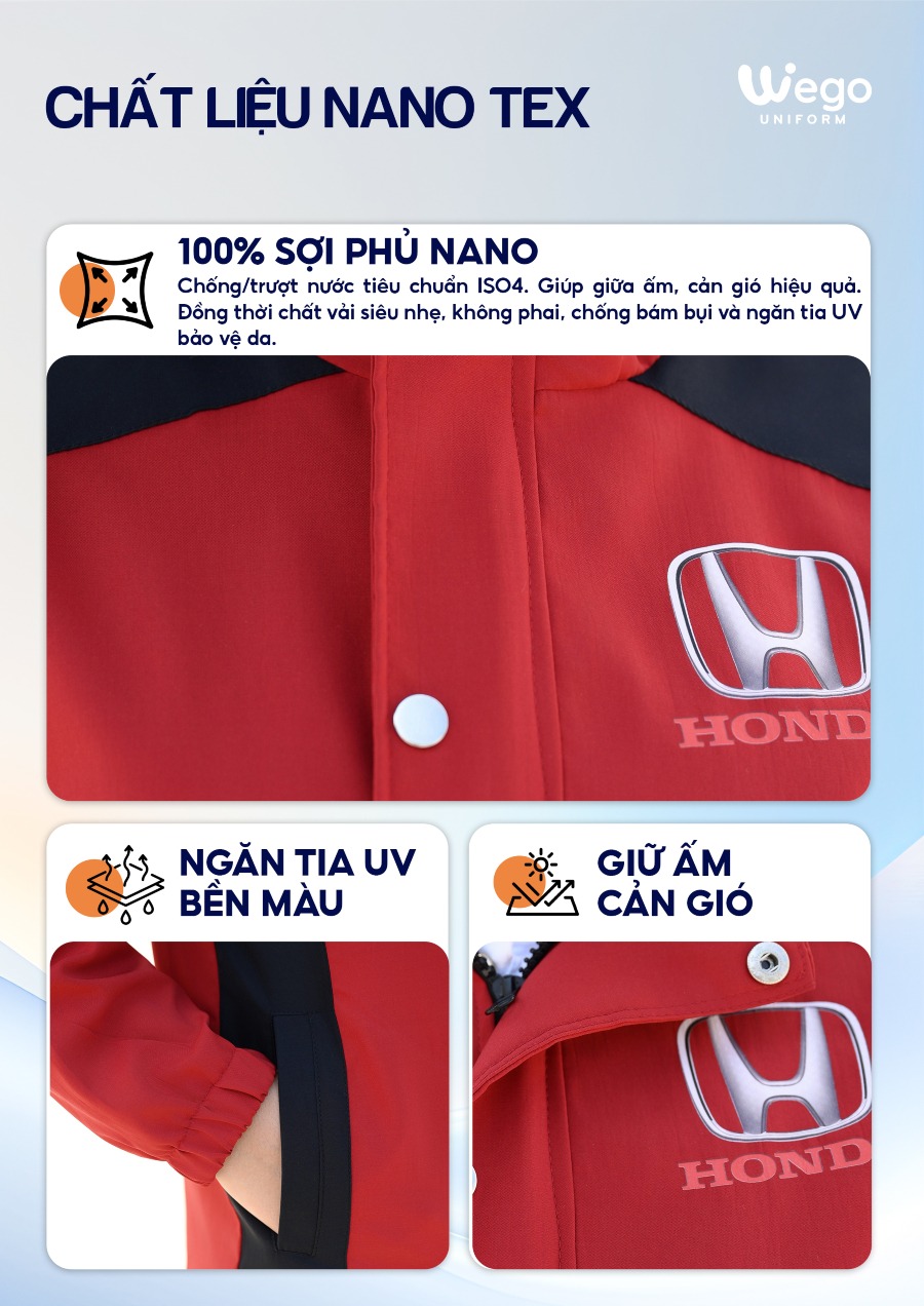 Chính vì vậy, áo đồng phục Wego luôn có độ bền cao, khả năng cản gió, giữ ấm, chống tia UV tốt. Từ đó mang lại sự thoải mái tối đa cho người mặc, ngay cả trong thời tiết mưa vừa và nhỏ, nắng nóng hay những môi trường làm việc đòi hỏi vận động trong thời gian dài.