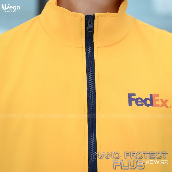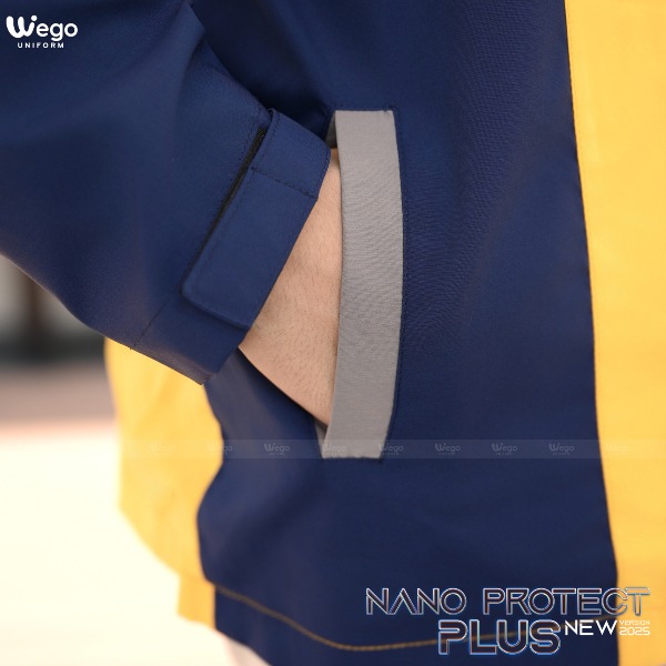 Áo gió Nano Protect Plus màu vàng bò phối xanh đen và ghi 02 sử dụng chất liệu NanoTex – Đây là loại vải độc quyền tại Wego Uniform với thành phần 100% sợi phủ nano.