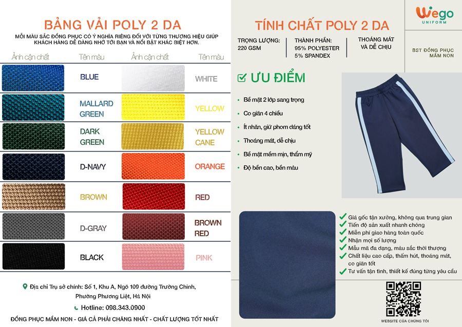 Sản phẩm Quần thể thao đồng phục mầm non màu xanh đen được làm từ chất liệu Poly 2 da có trọng lượng 220 GSM và thành phần từ 95% POLYESTER, 5% SPANDEX. Chất vải mang đến nhiều ưu điểm vượt trội, có thể kể đến như: