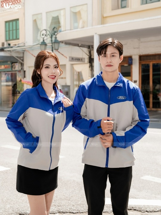 Đồng phục áo gió màu xanh bích và ghi sáng